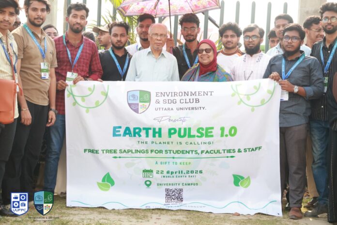 “বিশ্ব পৃথিবী দিবস ২০২৬” উপলক্ষে উত্তরা বিশ্ববিদ্যালয়ের Environment and SDG Club-এর উদ্যোগে আয়োজিত “Earth Pulse 1.0” কর্মসূচি সফলভাবে সম্পন্ন হয়েছে। অনুষ্ঠানে শিক্ষার্থী, শিক্ষক ও কর্মকর্তাদের স্বতঃস্ফূর্ত অংশগ্রহণে ক্যাম্পাসজুড়ে প্রায় ১৫০টি গাছের চারা বিতরণ ও রোপণ করা হয়।
